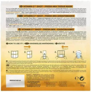 Garnier Vitamin C Shot Energise & Illumine Fresh-Mix Tissue Mask 33gm Garnier Fresh Mix Vitamin C Shot Face Mask - a concentrated shot of super hydrating serum in a sheet mask for dehydrated & dull skin, freshly mixed. The No1 Sheet Mask brand to intensDescription