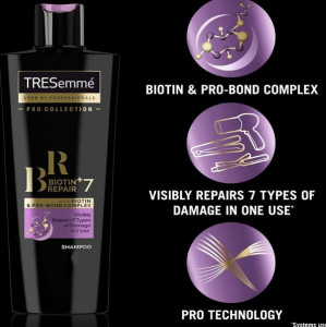 - TRESemme Biotin+ Repair seven shampoo visibly repairs seven types of damage in just one use.